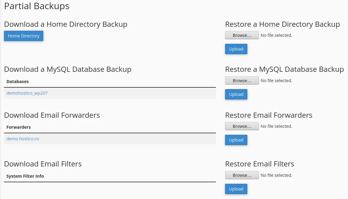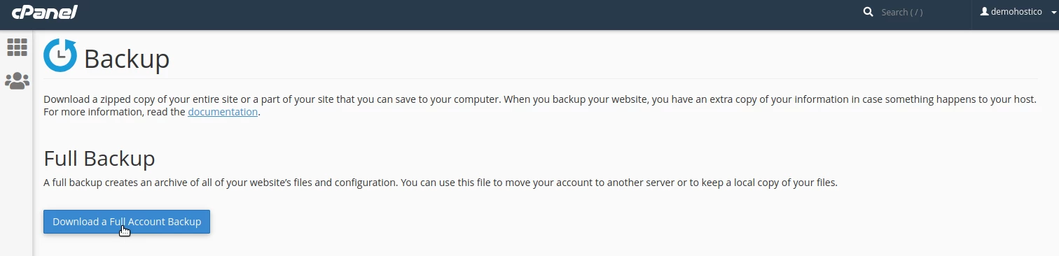 • This option will create an archive with all the files and settings of the account to be saved, but from the cPanel interface, this archive cannot be used for a complete restoration of a site. For a full restoration, you will need to contact us via email at: help@hostico.com